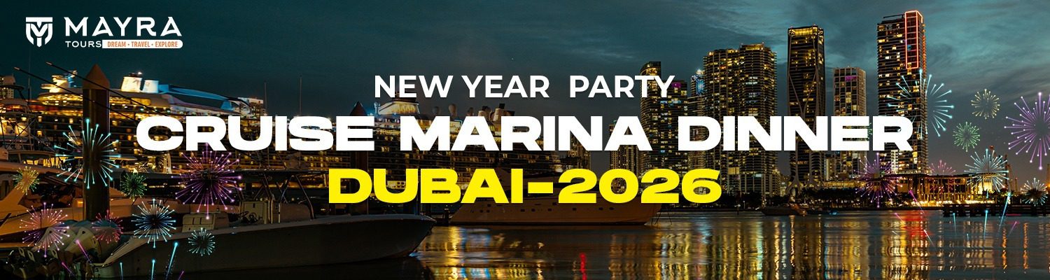 Ring in New Year’s Eve 2026 with an unforgettable celebration aboard our luxury Dubai Marina Dinner Cruise. At Mayra Tours, we believe New Year’s is more than just a date—it’s a magical night where the city sparkles, the music lifts your spirit, and every moment feels unforgettable. This year, we invite you to join us on our exclusive glass boat dhow cruise, where fine dining, live entertainment, and breathtaking Dubai fireworks come together for one epic night.